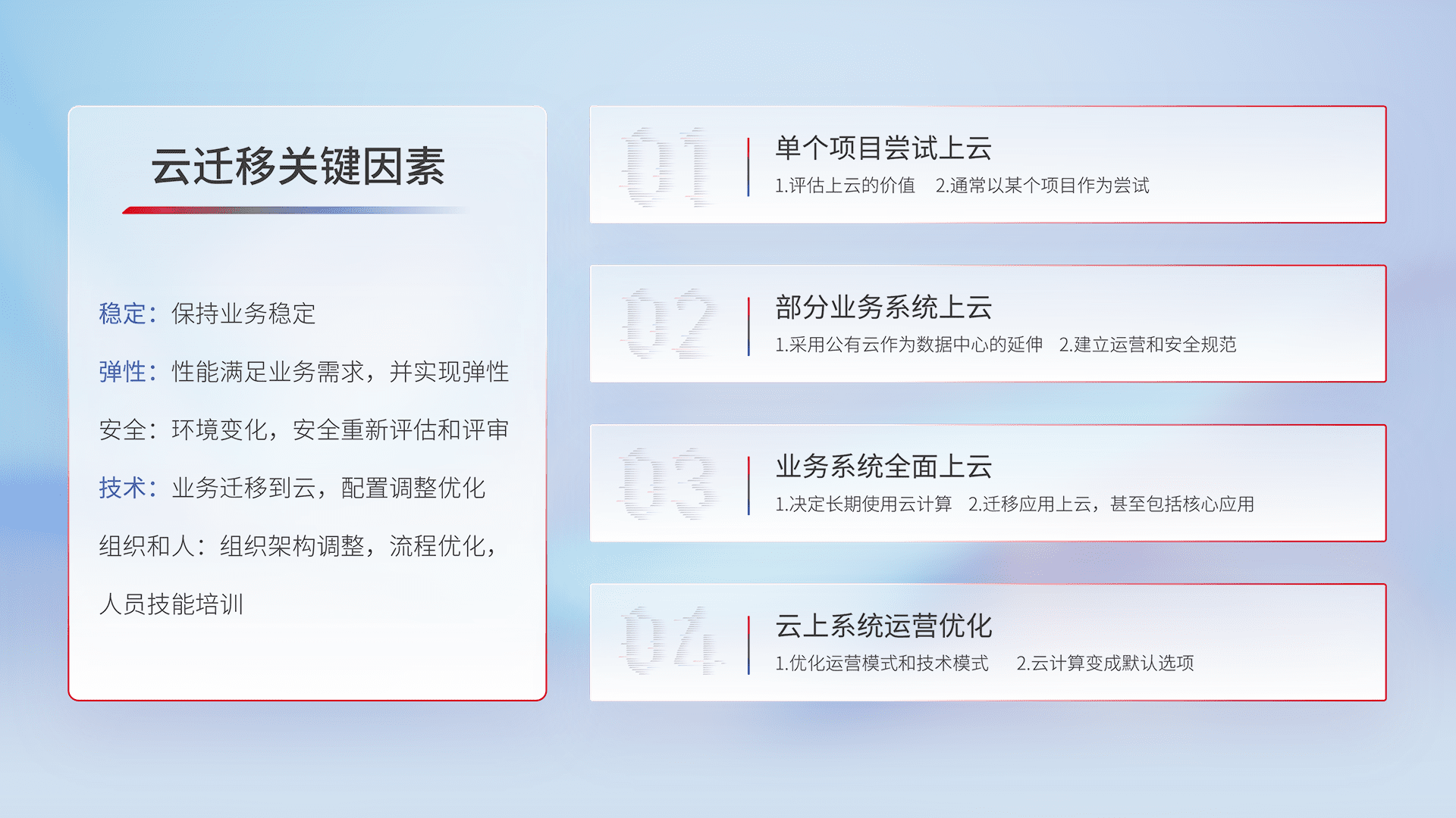 结合实际业务,,,从规划设计、、、、云平台选型、、、、云原生改造、、数据迁移、、集成交付,,,迁移全过程为客户识别最佳上云路径,,做好风险识别管理,,,,设计网络架构、、、身份权限、、、、安全审计合规、、、操作审计、、、日志审计、、、、监控告警策略、、多站点容灾设计等,,,对云上基础设施进行整体规划,,,提升IT治理水平,,以满足弹性、、高可用、、高性能的需求。。